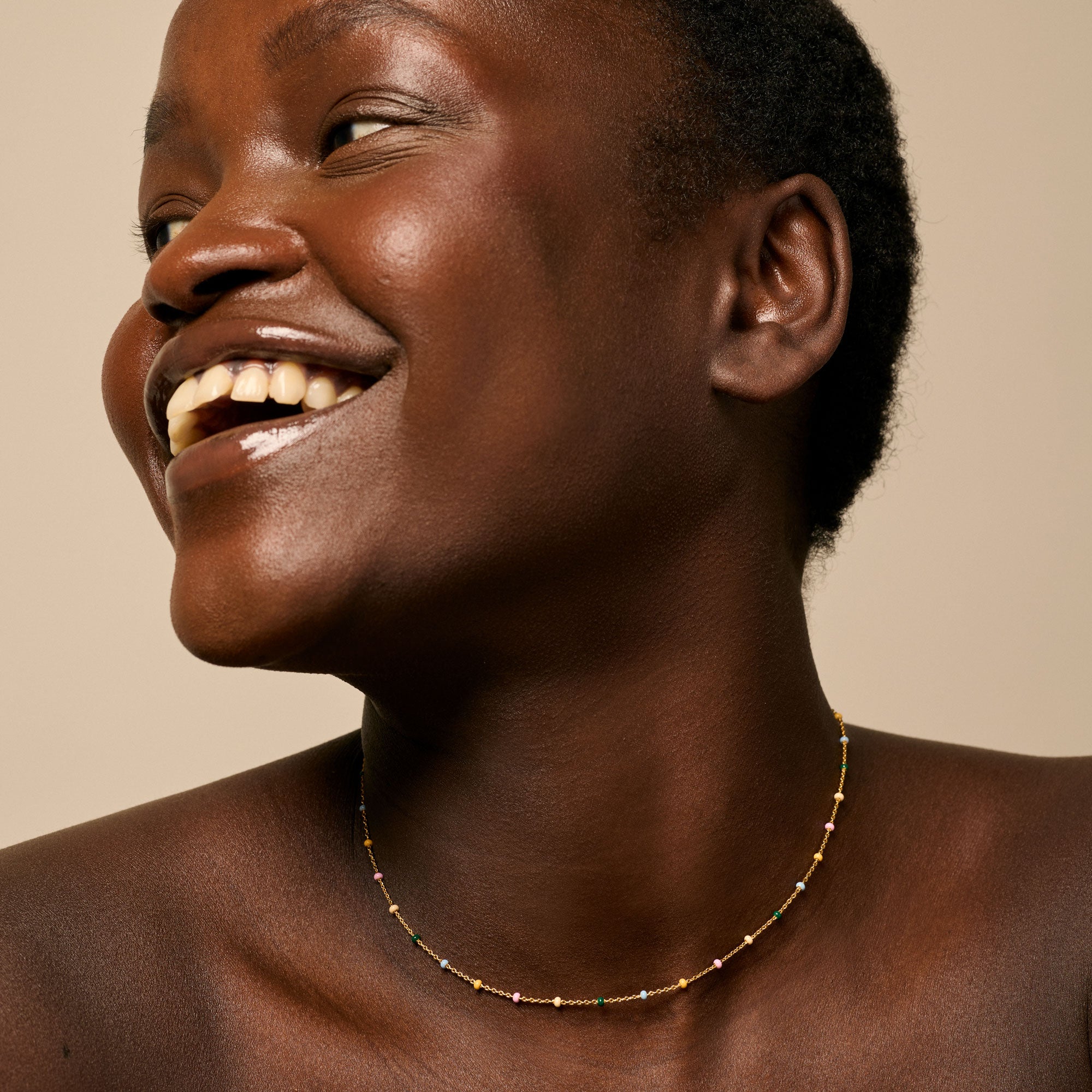 Lola er en af ENAMEL Copenhagens mest elskede kollektioner. Serien er kendt for sine fine kæder med små håndmalede emaljekugler, der giver smykkerne et let, farverigt og legende udtryk.