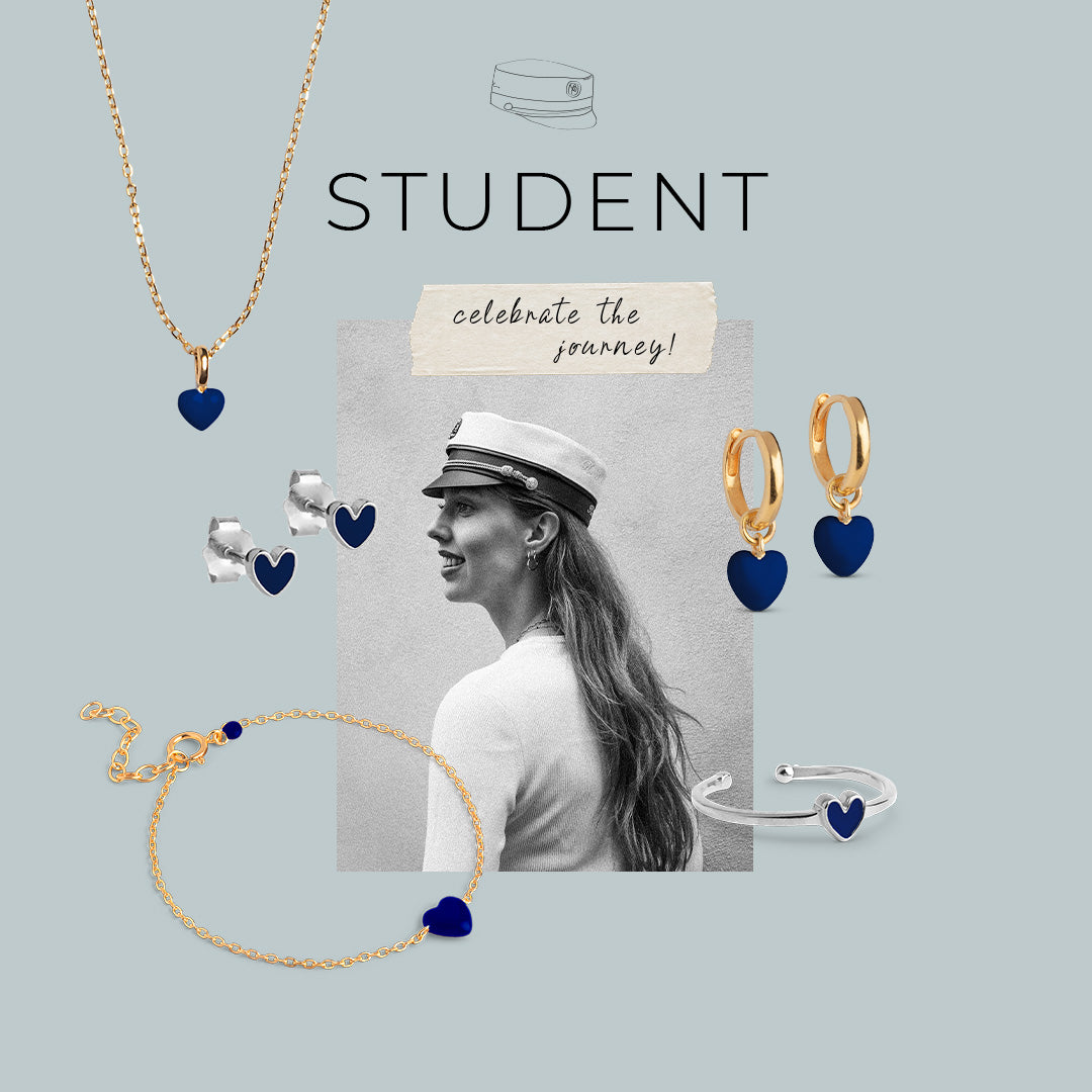 Vores smykkesæt er designet med inspiration fra studentens farver – blå og bordeaux – og sammensat, så de fungerer perfekt sammen.