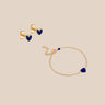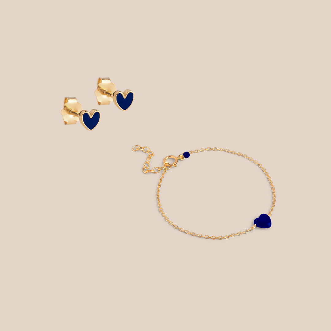 Amore Armbånd og Studs Amore samler det fine hjertesymbol i to forskellige udtryk – ét, der smyger sig om håndleddet, og ét, der ligger tæt ved ansigtet. I de dybe mørkeblå nuancer skaber de en harmonisk helhed og tilfører et roligt, personligt udtryk – ideelt til at fejre en særlig milepæl som student.