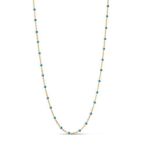 Armbåndet Lola er en fortryllende kæde af små himmelblå emaljekugler. Dette armbånd tilføjer en frisk og luftig detalje til dit outfit og udstråler subtil elegance. Med sin unikke himmelblå farve tilføjer Lola et strejf af lethed og kan let kombineres med andre smykker for at skabe et unikt udtryk. Vær opmærksom på at undgå at bære vores Lola-stil i brusebadet eller når du sover, og hold det væk fra parfumer og cremer, da dette kan påvirke emaljens farve og struktur.