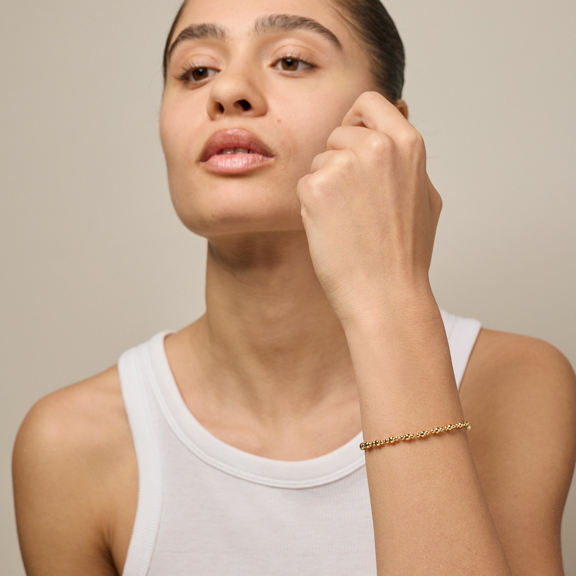 Norma Bead Bracelet er et elegant og legende armbånd sammensat af små, blankpolerede guldkugler i forskellige størrelser. De fine variationer skaber et organisk flow og giver smykket et feminint og raffineret udtryk. En lille beige emaljekugle ved låsen tilføjer et diskret og charmerende twist.Perfekt alene – eller i et mix med andre armbånd for et personligt look."