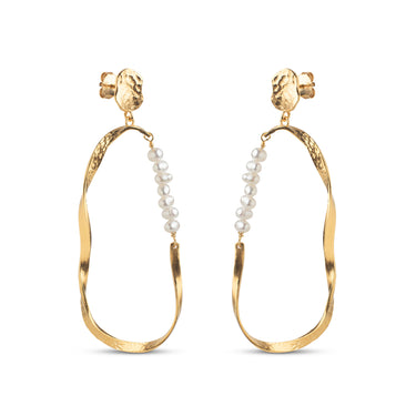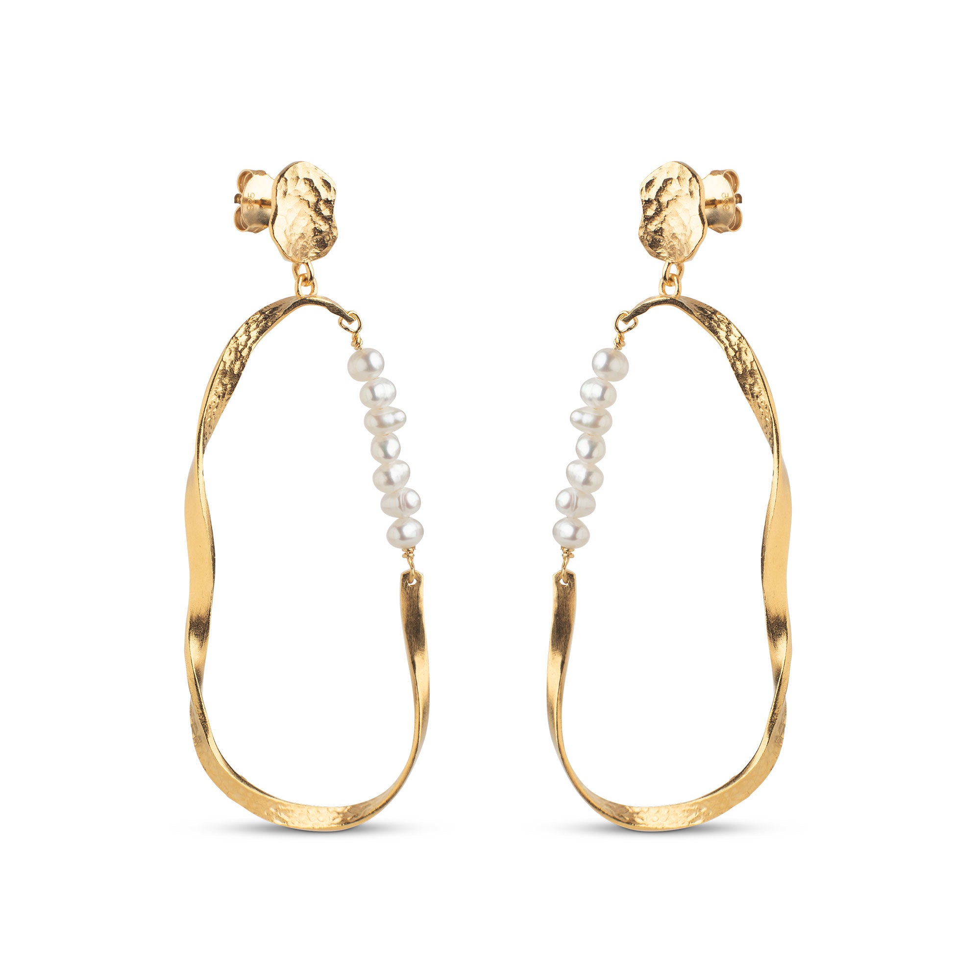 Aloma pearl øreringene, forgyldt med 18 karats guld, har et helt særligt voluminøst og på samme tid let udtryk. De består af en håndlavet ørestik, der buer smukt, og dermed lægger sig flot på øreflippen. Under ørestikken sidder der et tvistet stykke metal, afbrudt af en række perler, der giver øreringene et artistisk udtryk. Aloma pearl øreringene findes i en lille og stor udgave, hvoraf den store især er god til festlige lejligheder, med dens volumen og ekstraordinære udtryk. Bær dem som et par eller skab et anderledes udtryk, og brug en Aloma pearl large i det ene øre og en Carmen ørering i det andet.