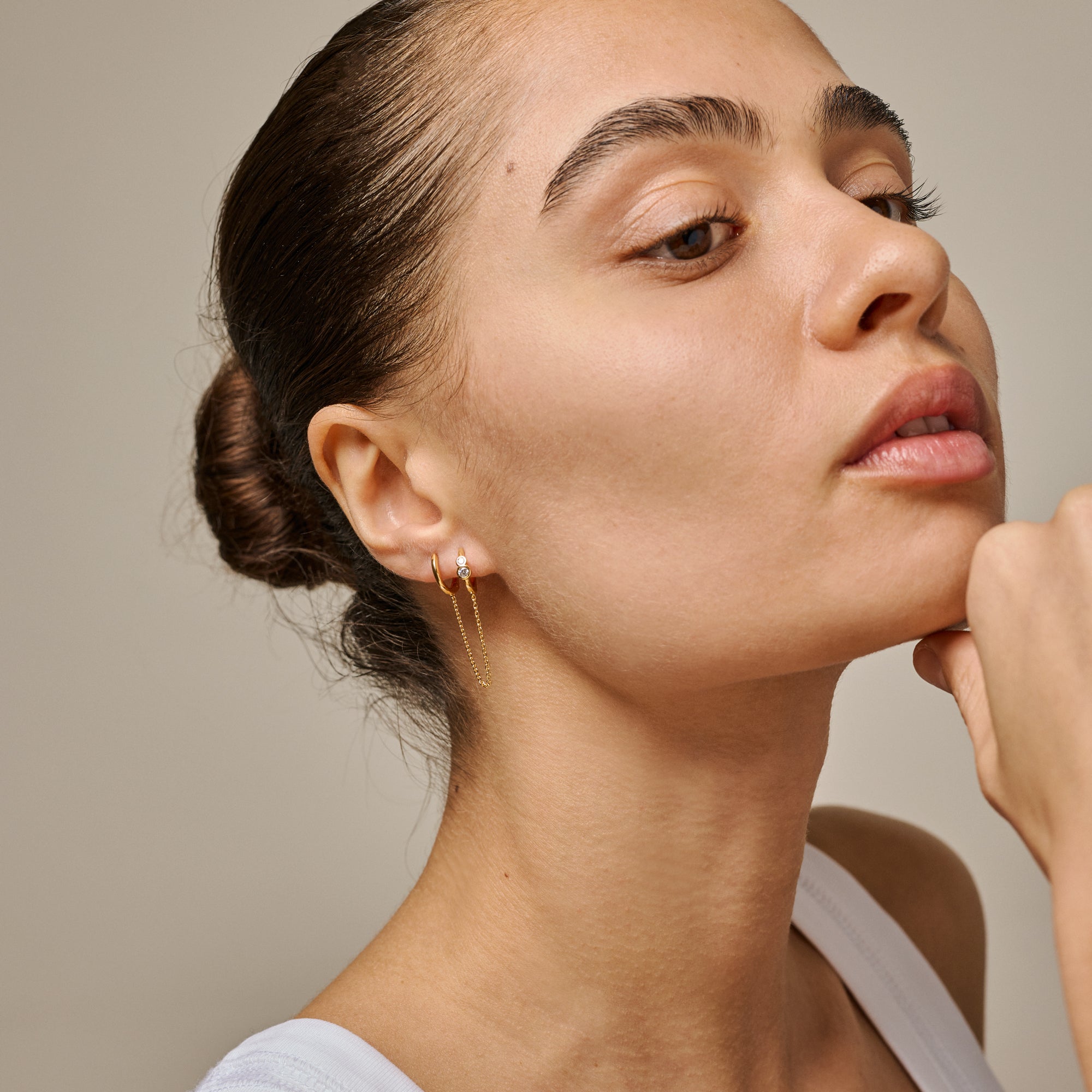 Nova Chain Hoops er en moderne fortolkning af den klassiske hoop – med et overraskende twist. Denne unikke double hoop earring består af to små, blankpolerede hoops forbundet af en fin kæde, der skaber illusionen af to separate øreringe, men i virkeligheden hænger sammen som én. Den ene hoop er prydet med to klare zirkonia-sten, som tilfører glans og elegance. Designet er særligt skabt til dig med to huller i samme øre, og stilen kombinerer minimalistisk kædeørering med et råt, men raffineret udtryk. Begge hoops har kliklås, der gør dem nemme at tage på og sikre i brug. Nova Chain er perfekt til dig, der elsker kreativ styling af ørepiercinger, og ønsker noget anderledes, men stadig elegant. Brug Nova Chain alene som et statement – eller mix den med små studs og hoops for et personligt, lag-på-lag look. Obs: Nova Chain sælges stykvis.