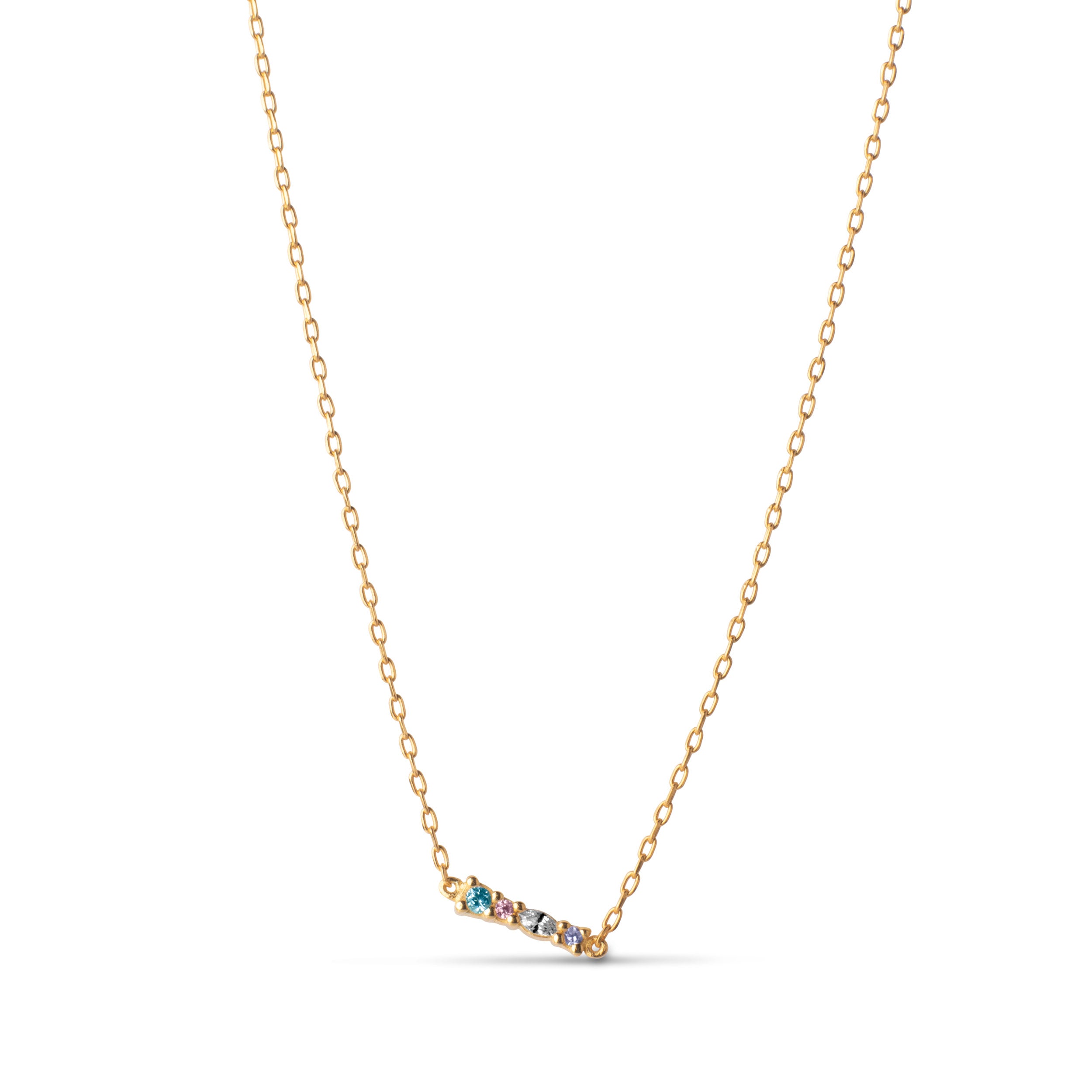 Smykket er prydet med kubisk zirkon, en syntetisk ædelsten, der skinner smukt og ofte bruges som et prisvenligt alternativ til diamanter. Den er oftest lige så smuk som en diamant, men mere tilgængelig og prisvenlig.