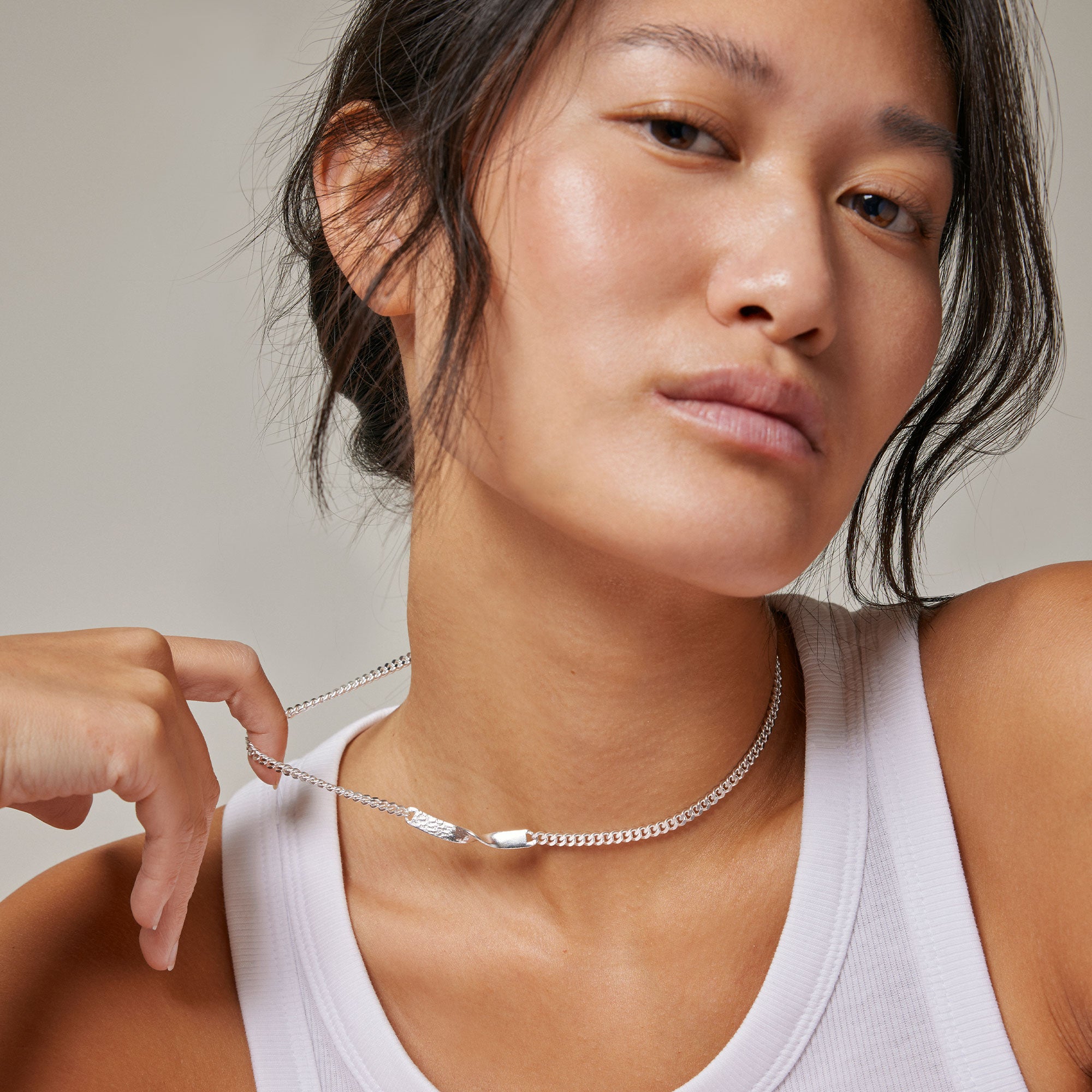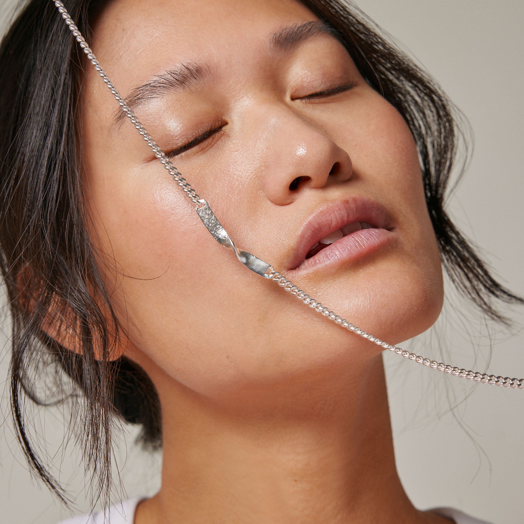 Nadia, er en 925 sterlingsølv halskæde fra ENAMEL Copenhagen, med mere volumen end sædvanlig. Panzerkædens stilrene look går super godt i spænd med de rå detaljer på det tvistede vedhæng. Vedhænget buer en smule, så det lægger sig pænt, på kravebenet. Nadia er uden tvivl noget for dig, hvis du godt kan lide et chunky, men feminint smykke, med maskuline detaljer. Nadia findes også som armbånd, samt forgyldt med 18 karat guld.