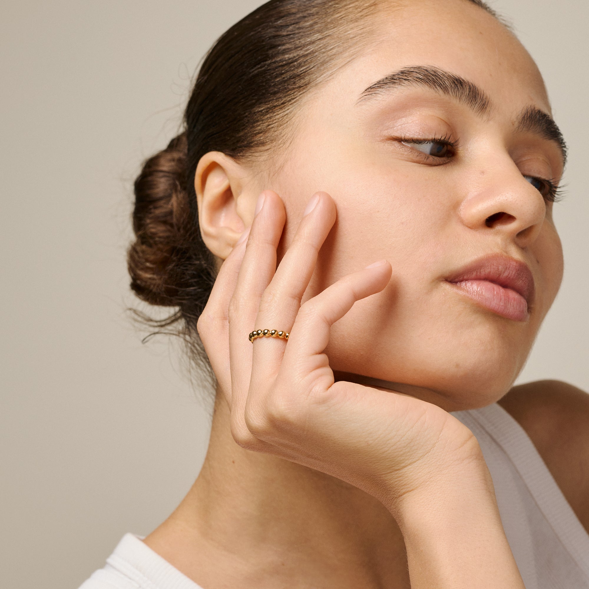 Om smykket: Ball Ring i 18k forgyldt 925 sterlingsølv er en elegant og cool fingerring, der matcher vores populære ball hoops. Designet er enkelt og klassisk, men med de små kugler får ringen et moderne og karakterfuldt udtryk. Den er justerbar og kan nemt tilpasses, så den passer til netop din finger – perfekt til både hverdag og layering med andre ringe.