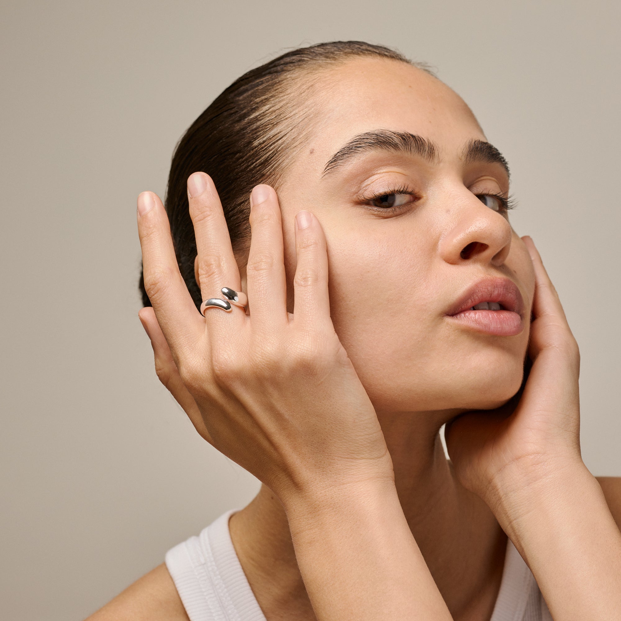 Om smykket: Neli Ring, i 925 sterlingsølv, er designet med inspiration fra naturens bløde bevægelser. Den har en elegant, åben silhuet med voluminøse former, der smyger sig omkring fingeren. Den blanke overflade giver et eksklusivt og moderne udtryk, mens den justerbare størrelse sikrer, at den passer perfekt til dig – uanset anledning. Neil ringen findes også belagt med 18 karat guld.