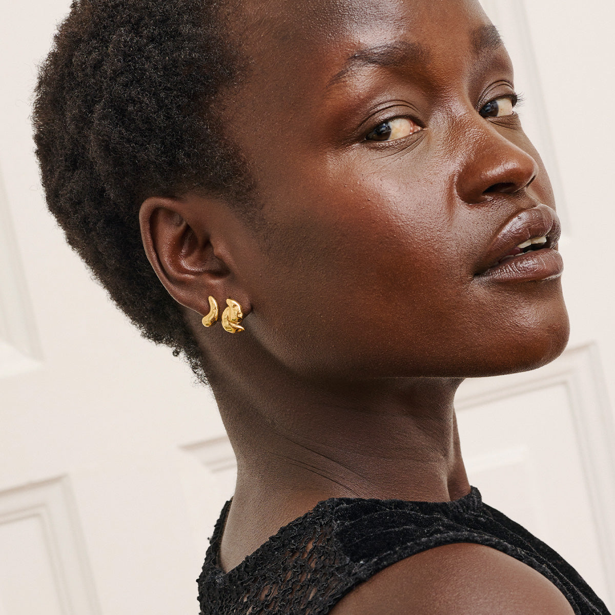 Om smykket:Tova Stud er en karakterfuld ørestik med to svungne former, der spejler hinanden i en blød, kunstnerisk bevægelse. De bølgede konturer og den blanke, organiske overflade giver smykket liv og en sanselig dybde, der føles både moderne og naturlig. De to guldelementer fletter sig tæt sammen, og danner en samlet silhuet, som lægger sig elegant op ad øret, og skaber et sofistikeret, skulpturelt udtryk. Der er noget både roligt og kraftfuldt over guld-Tova – en stilren fortolkning af naturens former, med en særlig finesse. Hos ENAMEL elsker vi Tova for dens unikke opbygning og måde at spille med volumen og balance på. Et smykke, der skiller sig ud med ro, karakter og kompromisløs elegance. Tova ørestikken findes også i sølv.